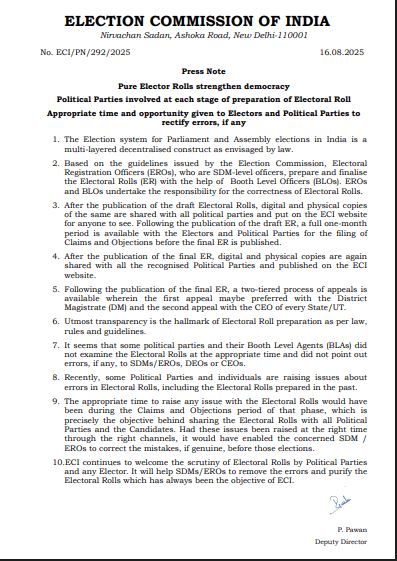 বল রাজনৈতিক দলগুলির কোর্টে ঠেলে কমিশনের দাবি, রাজনৈতিক দলগুলির ভূমিকা প্রতিটি ধাপে থাকে। অনেক দল ও বুথ স্তরের এজেন্ট সময়মতো খসড়া তালিকা পর্যালোচনা করেননি। আপত্তি জানানোর সুযোগ থাকা সত্ত্বেও আপত্তি তোলেননি। রাহুলের দিকে আঙ্গুল তুলে কমিশন প্রেস বিজ্ঞপ্তিতে লিখেছে, ‘সম্প্রতি কিছু রাজনৈতিক দল ও ব্যক্তি ভোটার তালিকায় ত্রুটি নিয়ে প্রশ্ন তুলছেন। এর মধ্যে আগের তালিকাগুলিও রয়েছে।’ কমিশনের বক্তব্য এই তালিকা দলগুলিকে জানানো হয়, যাতে সঠিক সময়ে সংশোধনের জন্য আবেদন জানানো যায়। খসড়া ভোটার তালিকা কমিশনের ওয়েবসাইটে থাকে যাতে সকলে সেটা দেখতে পারেন।