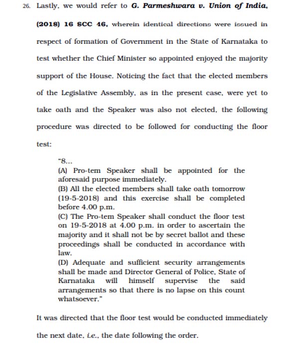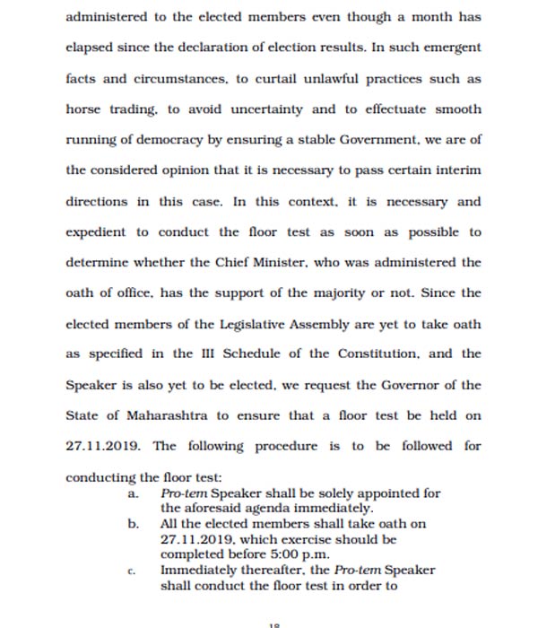সেই মতো আজ আদালত খুলতেই সু্প্রিম কোর্টের বিচারপতি এনভি রামান্না জানান, বিরোধীদের দাবিকে মান্যতা দিয়েই সংবিধানের নৈতিকতা প্রচার করতে হবে। এরজন্য মহারাষ্ট্রে আগামিকালই আস্থা ভোট হবে। প্রথমে তাড়াতাড়ি একজন প্রোটেম স্পিকার নিয়োগ করতে হবে। বিধায়কদের শপথগ্রহণ করানোর পর তিনিই আস্থা ভোট পরিচালনা করবেন। আর এই ভোট গোপন ব্যালেটে নয় করতে হবে প্রকাশ্যেই। বিধানসভা থেকে এর সরাসরি লাইভ টেলিকাস্টের ব্যবস্থা করতে হবে।