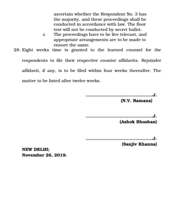 তাদের আবেদনে সাড়া দেয় তিন বিচারপতির ডিভিশন বেঞ্চ। সোমবারের সকালের মধ্যে রাজ্যপালের নির্দেশনামা ও সরকারের গঠনের আবেদন জানিয়ে জমা দেওয়া দেবেন্দ্র ফড়ণবিসের চিঠি আদালতে জমা করতে বলে। সোমবার তা জমা পড়ার পর ৮০ মিনিট ধরে শুনানি হয়। এরপর মঙ্গলবার সকাল সাড়ে দশটা নাগাদ রায় ঘোষণা করবে বলে জানায় সুপ্রিম কোর্ট।
