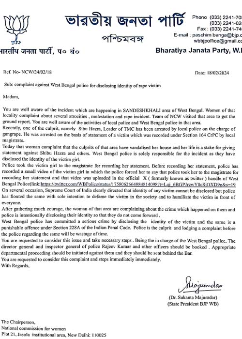 এদিকে, সন্দেশখালিতে এক নির্যাতিতার বয়ানের ভিত্তিতে পুলিশ শাহজাহান অনুগামী শিবু হাজরা ও উত্তম সর্দারের বিরুদ্ধে গণধর্ষণের মামলা যুক্ত করেছে। এ বিষয়ে রাজ্য পুলিশের ডিজি (DG) রাজীব কুমার জানিয়েছিলেন, ওই মহিলা ম্যাজিস্ট্রেটের কাছে গোপন জবানবন্দি দেন, তার ভিত্তিতেই ওই ধারায় মামলা দায়ের হয়েছে। তা নিয়ে বিজেপি রাজ্য সভাপতি সুকান্ত মজুমদারের অভিযোগ, পুলিশ নির্যাতিতার পরিচয় প্রকাশ করেছে, যা সুপ্রিম কোর্টের নির্দেশ অনুযায়ী বেআইনি। রাজ্য পুলিশের এই কাজের তীব্র নিন্দা করে সুকান্ত চিঠি পাঠিয়েছেন জাতীয় মহিলা কমিশনকে। তাঁর দাবি, মহিলা কমিশন এ বিষয়ে হস্তক্ষেপ করুক।
