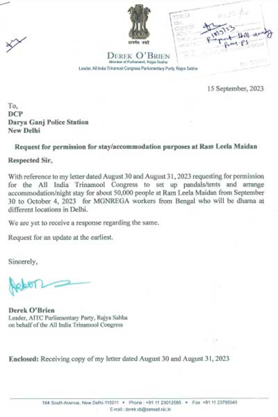 ডেরেক চিঠিতে উল্লেখ করেছেন, সেপ্টেম্বরের ৩০ তারিখ থেকে ৪ অক্টোবর পর্যন্ত দিল্লিতে কর্মসূচি রয়েছে। শামিল হবেন রাজ্যের বহু মানুষ। রামলীলা ময়দানে (Ramleela Maidan) তাঁদের থাকার জন্য তাঁবু তৈরি করতে চায় দল। সেই অনুমতি চাওয়া হয়েছে দরিয়াগঞ্জ থানার কাছে। এর আগে আগস্টের শেষে এই কর্মসূচির কথা দিল্লি পুলিশকে চিঠিতে জানিয়েছিলেন ডেরেক ও ব্রায়েন (Derek O Brien)। শুক্রবারের চিঠিতেও তার উল্লেখ করেছেন তৃণমূলের জাতীয় মুখপাত্র। তবে তার কোনও উত্তর আসেনি বলে ফের ডিসিপি-কে (DCP) চিঠি পাঠালেন তিনি।