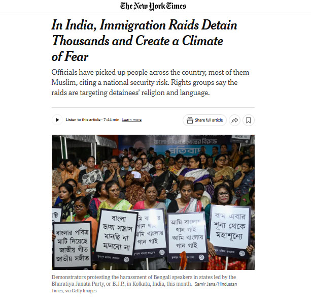 ‘দ্য নিউ ইয়র্ক টাইমস’ লিখেছে, মে থেকে জুলাইয়ের মধ্যে দু’হাজারেরও বেশি বাংলাভাষীকে জোর করে সীমান্ত পার করিয়ে বাংলাদেশে ফেলে দেওয়া হয়েছে। এই তথ্য নিশ্চিত করেছে ‘হিউম্যান রাইটস ওয়াচ’-এর এশিয়ার ডিরেক্টর মীনাক্ষী গঙ্গোপাধ্যায়। প্রতিবেদনে স্পষ্ট বলা হয়েছে, বিজেপি সরকার ইচ্ছাকৃতভাবে বাংলাভাষীদের ‘অনুপ্রবেশকারী’ আখ্যা দিয়ে দেশছাড়া করছে। এদের মধ্যে বহু পরিবার কয়েক পুরুষ ধরে ভারতের বাসিন্দা। প্রতিবেদনে লেখা হয়েছে, ভারত সরকার যাদের বিরুদ্ধে এই নিপীড়ন চালাচ্ছে, তাদের মধ্যে একটা বড় অংশ মুসলিম সম্প্রদায়ের। এমনকী বৈধ কাগজপত্র থাকা সত্ত্বেও তাঁদের উপর চলছে হেনস্তা। এর ফলে ভারতের ঐতিহ্যগত ঐক্য বিনষ্ট হচ্ছে, ‘বৈচিত্রের মধ্যে ঐক্যের’ বার্তা নস্যাৎ হচ্ছে।