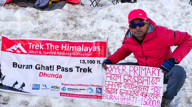 দীর্ঘ ন’ বছর ধরে উচ্চ প্রাথমিকে চাকরির জন্য আন্দোলনরত পশ্চিমবঙ্গের আপার প্রাইমারি চাকরিপ্রার্থীরা। এই চাকরিপ্রার্থীদের হাত ধরেই কলকাতা-সহ বিভিন্ন জেলায় অভিনব প্রতিবাদ দেখেছে পশ্চিমবঙ্গ। কখনও রাজপথে বসে, আবার কখনও পুলিশের ব্যারিকেড ভেঙে প্রতিবাদ দেখিয়েছেন এঁরা। এবার সেই চাকরিপ্রার্থীরাই আন্দোলনের পথ বেছে নিলেন অন্য পথে। উত্তরাখণ্ডে পর্বতারোহণের (Climbing) পর তাঁরা পতাকা উত্তোলনের পাশাপাশি প্রতিবাদী পোস্টার তুলে ধরেন। তাতে লেখা, ”আপার প্রাইমারিতে নিয়োগ চাই। মামলাকে ঢাল করে কমিশনের ৯ বছরের ছলচাতুরি বন্ধ হোক।”