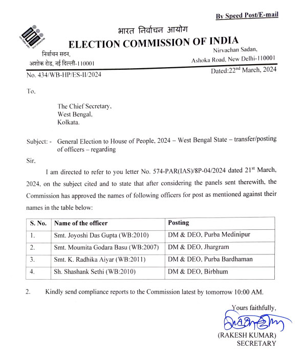 মাত্র একদিন আগে, ২১ মার্চ রাজ্যের চার জেলার জেলাশাসককে সরিয়ে দিয়েছিল জাতীয় নির্বাচন কমিশন (ECI)। এর মধ্যে ছিল পূর্ব মেদিনীপুর, পূর্ব বর্ধমান, বীরভূম এবং ঝাড়গ্রাম। ২৪ ঘণ্টা পরই তাঁদের জায়গায় জেলাশাসক নিয়োগের বিজ্ঞপ্তি (Notification) দিল কমিশন। ঝাড়গ্রামের জেলাশাসকের দায়িত্ব দেওয়া হল মৌমিতা গোদারা বসুকে। এর আগে তিনি একাধিক জেলায় অত্যন্ত দক্ষতার সঙ্গে এই পদে দায়িত্ব পালন করেছেন। এছাড়া পূর্ব মেদিনীপুরের জয়শী দাশগুপ্ত, পূর্ব বর্ধমানের কে রাধিকা আইয়ারও আমলা হিসেবে বরাবর প্রশংসার দাবিদার। এবার তাঁদের উপরই জেলায় জেলায় সুষ্ঠুভাবে ভোট পরিচালনার ভার দিল জাতীয় নির্বাচন কমিশন।