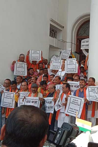 বাইরে বেরিয়ে শুভেন্দু অধিকারীর (Suvendu Adhikari) নেতৃত্বে চলতে থাকে তাঁদের বিক্ষোভ। স্লোগান ওঠে ‘দুর্নীতিকে আড়াল করা রাজ্যপালের ভাষণ শুনছি না, শুনব না।’ মনোজ টিগ্গা, শংকর ঘোষরা সামনের সারি থেকে বিক্ষোভ করেন। রাজ্যপাল সিভি আনন্দ বোস ভাষণের শুরুতে বলেন, ”রাজ্যপাল আইনশৃঙ্খলা পরিস্থিতি ভাল।” বিজেপি তাতেই ক্ষেপে ওঠে। আবাস যোজনা, নিয়োগ দুর্নীতি নিয়ে সরব হন তাঁরা। আইএসএফ বিধায়ক নওশাদ সিদ্দিকি (Nawsad Siddiqui) জেলে কেন? তা সেই জবাব চেয়েও স্লোগান তোলে বিজেপি। ‘মোদি মোদি’ জয়গান শুরু হয়।