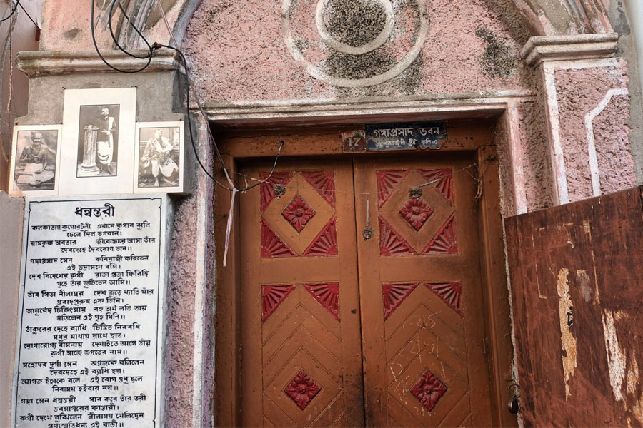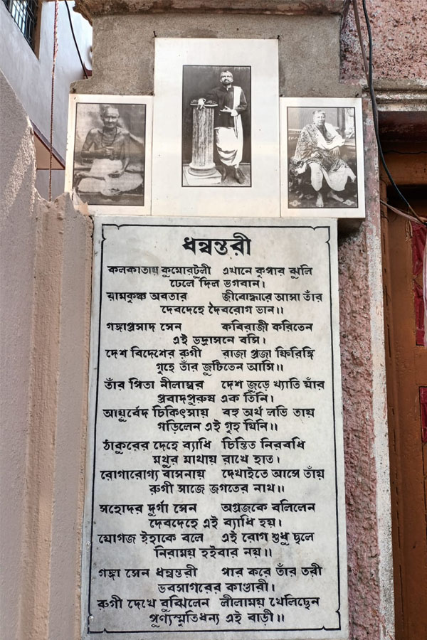 যে দরজা দিয়ে কুমোরটুলি স্ট্রিটের এই বাড়িতে ঢুকতে হয়, তার পাশের দেওয়ালে সাদা মার্বেলের উপর খোদাই করা— ‘ঠাকুরের দেহে ব্যাধি চিন্তিত নিরবধি/ মথুর মাথায় রাখে হাত/ রোগারোগ্য বাসনায় দেখাইতে আসে তাঁয়/ রুগী সাজে জগতের নাথ।’ সালটা ১৮৫৮। রানি রাসমণির জামাতা মথুরবাবুর আহ্বানে শ্রীরামকৃষ্ণের চিকিৎসার ভার গ্রহণ করলেন গঙ্গাপ্রসাদ। ধন্বন্তরি গঙ্গাপ্রসাদ দেখে বুঝলেন, এ যোগজ ব্যাধি! সারবার নয়। লেখা আছে সেই কথাও— ‘যোগজ ইহাকে বলে এই রোগ শুধু ছলে/ নিরাময় হইবার নয়।’ কুমোরটুলি স্ট্রিটের ১৭ নম্বর বাড়িটিকে নিয়েই আজ আমাদের আলোচনা।