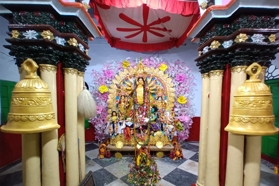 মৃন্ময়ী একচালার। হারু পাল চারপুরুষ ধরে গড়ছেন প্রতিমা। বাঁ-দিকে গণেশ। এটাই পরম্পরা। ভগবতী ‘শ্রী’ আর ‘ধী’ অর্থাৎ সমৃদ্ধি ও বুদ্ধির যুগ্ম প্রতিরূপে তিনি বামা। গণেশের উপস্থিতিও তাই বাঁ-দিকে। দশমীর দিন বড় গঙ্গাজলের গামলায় দর্পণে ছায়া দেখে প্রতিমা বিসর্জন হয়। আদি রীতি এটি। তা এই বাড়ির পুজো নিয়ে স্মরণীয় কোনও ঘটনার কথা মনে পড়ে? প্রশ্নটি ছুড়ে দিয়েছিলাম গঙ্গাপ্রসাদ ভবনের আর-এক উত্তরাধিকার পার্থ সেনকে। অভিজ্ঞতার ঝাঁপি খুলে তিনি বললেন, ‘‘সালটা মনে নেই। তবে দু-দু’টো ঘটনার কথা মনে পড়ছে। আমরা তখন বাড়ির পুজো নিয়ে ব্যস্ত। হঠাৎ দেখি, ‘গার্ড ডগ’ নিয়ে দু-তিনজন নিরাপত্তারক্ষীকে আমাদের বাড়ি ঢুকতে। আমরা তো অবাক! জানতে পারি, আমাদের পুজো দেখতে আসছেন প্রাক্তন মুখ্যমন্ত্রী সিদ্ধার্থশঙ্কর রায়। সারপ্রাইজ ভিজিট ছিল সেটা।’’ আরও একটা ঘটনার কথা বলছিলেন… ‘‘হ্যাঁ, সেই ঘটনার স্মৃতিও টাটকা। এক বছর তো এসেছিলেন বিখ্যাত ফটোগ্রাফার রঘু রাই। বললেন, কলকাতা নিয়ে কাজ করছেন। বেশ কিছুক্ষণ আমাদের বাড়ির পুজোর ছবি তুলে শোভাবাজার রাজবাড়ি যেতে চাইলেন। তাঁর সঙ্গে আমরাও দু’জন গিয়েছিলাম। তিনি এতটাই বিখ্যাত, সবাই তাঁর সঙ্গে ছবি তুলতে ব্যস্ত হয়ে পড়লেন। বেশ মজা লাগছিল। যে মানুষটা ক্যামেরায় ধরতে এসেছেন পুজোর মুহূর্তগুলি, সেই মানুষটাকে নিয়েই সবাই ছবি তুলতে লাগলেন।’’