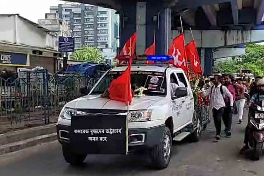 সকাল ১১.৩৮: তিরিশ মিনিট পর বিধানসভা থেকে বের হল বুদ্ধবাবুর দেহ। এবার গন্তব্য মুজফফর আহমেদ ভবন। তাঁকে শেষশ্রদ্ধা জানাতে মানুষের ঢল।
