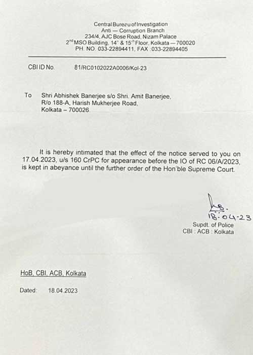 কিন্তু সোমবার সুপ্রিম কোর্টের এই স্থগিতাদেশের পরও দুপুরে অভিষেকের কাছে পৌঁছয় সিবিআইয়ের নোটিস। যাতে লেখা, তাঁকে মঙ্গলবার বেলা ১১টায় নিজাম প্যালেসে হাজিরা দিতে হবে। সেই নোটিস নিয়ে শোরগোল পড়ে যায়। অভিষেক নিজে এ নিয়ে টুইট করে অভিযোগ তোলেন, ”রাজনৈতিক উদ্দেশে হেনস্তা করার জন্য় এই নোটিস।” প্রশ্ন উঠে যায়, কেন সুপ্রিম কোর্টের স্থগিতাদেশের পরও হাজিরার নোটিস পাঠানো হল। এ বিষয়ে দলের মুখপাত্র কুণাল ঘোষ ব্যাখ্যা দিয়ে জানিয়েছিলেন, এটা সিবিআইয়ের কোনও তদন্তের জন্য হাজিরা নয়। আদালতের রায়ের নিরিখে সামঞ্জস্য রেখে সেই নোটিস দেওয়া হয়েছে।”