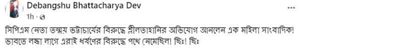 বিষয়টা ঠিক কী? রবিবার দুপুরে এক তরুণী সাংবাদিক ফেসবুক লাইভ করেন। সেখানেই তিনি দাবি করেন, এদিন তাঁর তন্ময় ভট্টাচার্যের সাক্ষাৎকার নেওয়ার কথা ছিল। সেই মতো তিনি সিপিএম নেতার কাছে পৌঁছে যান। তাঁর অভিযোগ, ইন্টারভিউ নেওয়ার আগেই তন্ময়বাবু নাকি তাঁর কোলে বসে পড়েন। মহিলা স্পষ্টভাবে জানান, তিনি এসব পছন্দ করেন না। ওই সাংবাদিকেদর অভিযোগ, বরাবরই নিজের মাত্রার বাইরে গিয়ে ইয়ার্কি-ঠাট্টা করেন তন্ময় ভট্টাচার্য। পছ্ন্দ না হলেও বিষয়টাকে নিজের মতো করে এড়িয়ে যেতেন তিনি। তবে এদিন বিষয়টা মাত্রা ছাড়ানোয় ফেসবুক লাইভ করেন নিগৃহীতা।