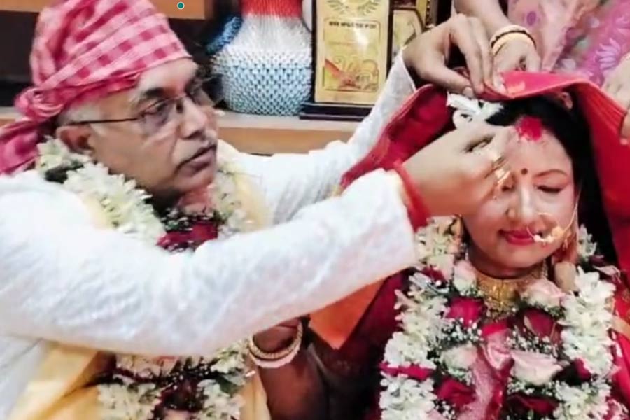 সন্ধ্যা ৬.৫৬: পানপাতায় মুখ ঢেকে এলেন কনে। বিয়ের মণ্ডপে দিলীপ-রিঙ্কুর মালাবদল। চারহাত হল এক।