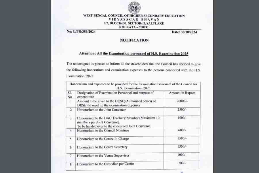 সংসদের বিজ্ঞপ্তি অনুযায়ী, উচ্চ মাধ্যমিকের সঙ্গে যুক্ত ডিস্ট্রিক্ট ইন্সট্রাক্টরদের বা ডিআই পরীক্ষার খরচ সামলাতে দেওয়া হবে ২০ হাজার টাকা। তাঁদের আগেও পরীক্ষার খরচ সামলাতে টাকা দেওয়া হত। পরের ধাপে জয়েন্ট কনভেনার তথা যুগ্ম আহ্বায়ককে সাম্মানিক হিসেবে দেওয়া হবে আড়াই হাজার টাকা। যুগ্ম আহ্বায়কের তত্ত্বাবধানে থাকবেন ১০ শিক্ষক-শিক্ষিকা। তাঁদের মাথাপিছু সাম্মানিক দেওয়া হবে দেড় হাজার টাকা। এই টাকা যুগ্ম আহ্বায়ককে দেওয়া হবে। তিনিই তা বাকিদের দেবেন। এর পাশাপাশি সংসদ মনোনীত সদস্যকে সাম্মানিক হিসেবে দেওয়া হবে ৬০০ টাকা। পরীক্ষাকেন্দ্রের ইন চার্জ ও সেক্রেটারি পাবেন দেড় হাজার টাকা। পাশাপাশি ভেনু সুপার ভাইজার পাবেন ১ হাজার টাকা। পরীক্ষাকেন্দ্রের কাস্টোডিয়ান পাবেন ৭০০ টাকা। এই প্রথমবার এই সাম্মানিকের ব্যবস্থা করল সংসদ।