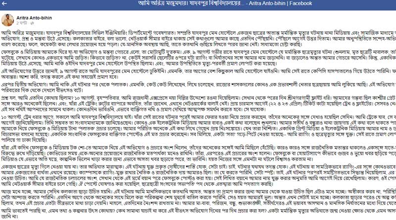 অরিত্র যাদবপুর বিশ্ববিদ্যালয়ের সিভিল ইঞ্জিনিয়ারিং (Civil Engineering) বিভাগে গবেষণা করেন। ৯ আগস্ট রাতে মেন হস্টেলে ছাত্রমৃত্যুর পর ১০ তারিখই কলকাতা ছাড়েন তিনি। চলে যান কাশ্মীরে, গ্রেট লেকসে ট্রেকিং (Trekking) করতে। আর সেই এলাকায় মোবাইলে নেটওয়ার্ক পাওয়া যায় না। সেই কারণে এতদিন তাঁর সঙ্গে যোগাযোগ করা যায়নি। ফেসবুক পোস্টে এমনই দাবি করেছেন অরিত্র ওরফে আলু। তার আগে বেশ কয়েকদিন ধরেই তিনি হস্টেলে যাচ্ছিলেন না বলে দাবি তুলে করে তাঁর প্রশ্ন, সেক্ষেত্রে কীভাবে এই ঘটনায় জড়িত থাকা এবং প্রমাণ লোপাটের চেষ্টার মতো অভিযোগ উঠছে তাঁর বিরুদ্ধে? তিনি ‘ষড়যন্ত্রকারী’, ‘পলাতক’ – এসব প্রচারের ক্ষেত্রের কার্যত সংবাদ মাধ্যমকেই দায়ী করেছেন অরিত্র।