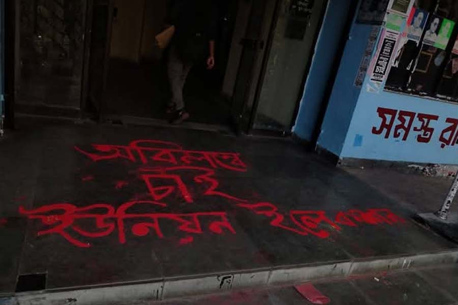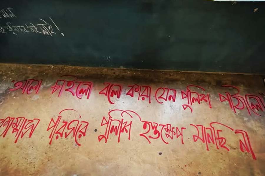 ব্যাপারটা ঠিক কী? ওয়ার্ল্ড ভিউ থেকে বাংলা বিভাগের সিঁড়ি, বিশ্ববিদ্যালয়ের একাধিক করিডোরে আবিরে ফুটে উঠেছে স্লোগান। কোথাও লেখা ‘ছাত্র সংসদ নির্বাচন চাই’। কোথাও আবার লেখা, ‘পুলিশি হস্তক্ষেপ মানছি না।’ বিশ্ববিদ্যালয়ের কোনও বারান্দায় লাল আবিরে ফুটে উঠেছে ইন্দ্রানুজ রায়ের প্রসঙ্গও। সব মিলিয়ে অন্যরকম দোল যাদবপুর বিশ্ববিদ্যালয়ে।
