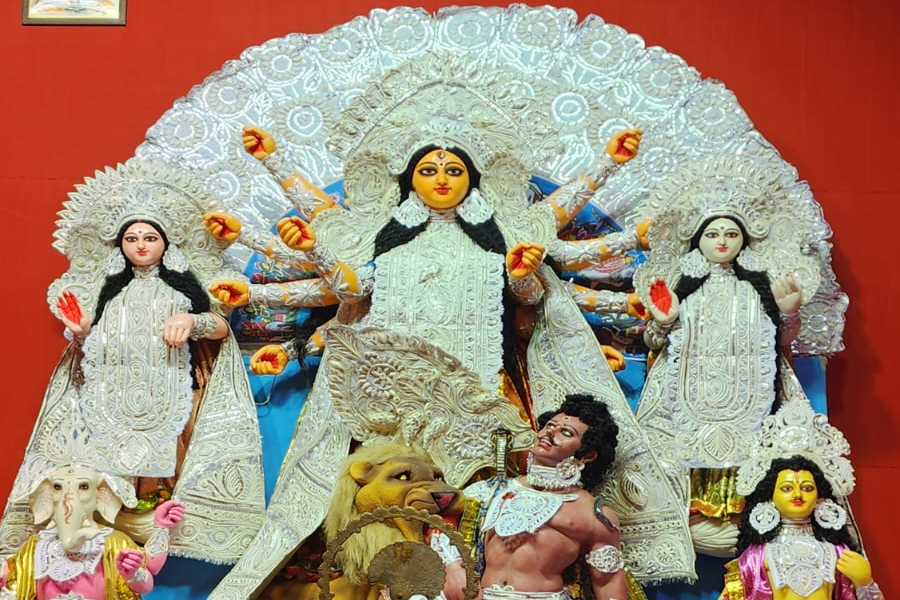 দশ বছরে পা দিল রাজারহাটের সিলভার ওক এস্টেট রেসিডেন্ট ওয়েলফেয়ার অ্যাসোসিয়েশন। পুজোর কর্মকর্তা সুদীপ্ত মাইতি জানিয়েছেন, এবারের পুজোর থিম ‘নগর বৃক্ষরোপণ’। শহর বাড়ছে পরিসরে। পুরনো জীর্ণ বাড়ি ছেড়ে স্মার্ট সিটির সংজ্ঞা এখন জিরাফের গলার মতো উঁচু উঁচু ফ্ল্যাট। সুদীপ্তর কথায়, সবুজ যেন না কমে। প্রতিটি ফ্ল্যাটের ব্যালকনিতে থাকুক সবুজ-সতেজ পাতা। সেই চিন্তা থেকেই এই থিম। সিলভার ওক এস্টেট রেসিডেন্ট ওয়েলফেয়ার অ্যাসোসিয়েশনের পুজোপ্রাঙ্গণে এগারোশো গাছ। প্রতিমা তৈরি করেছেন প্রদীপ রুদ্র পাল। বিটপীর সমারোহ থেকে উঁকি দিচ্ছেন মা।
