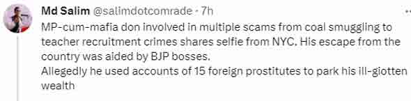 চোখের চিকিৎসা করাতে আমেরিকায় রয়েছেন অভিষেক বন্দ্যোপাধ্যায়। সেখান থেকে সেলফি পোস্ট করেছেন তিনি। এদিকে রাশিয়ান বান্ধবী ইস্যুতে নাম না করে তাঁকে নিশানা করছে বিরোধীরা। এবার আরও এক ধাপ এগিয়ে কুরুচিকর ভাষায় তৃণমূল সাংসদকে নিশানা করলেন সেলিম। অভিষেকের ছবি পোস্ট করে টুইটারে তিনি লিখেছেন, “সাংসদ ওরফে মাফিয়া ডন কয়লা পাচার থেকে নিয়োগ দুর্নীতির মতো একাধিক অপরাধে অভিযুক্ত নিউইয়র্ক থেকে সেলফি পোস্ট করছেন। দেশ থেকে পালিয়েছেন। আর তাতে সাহায্য করেছেন তাঁর বিজেপির ‘বস’রা।” এরপরই তাঁর সংযোজন, “অসদুপায়ে প্রাপ্ত অর্থ পাচার করতে ১৫ জন বিদেশি পতিতার অ্যাকাউন্ট ব্যবহার করা হয়েছে।”