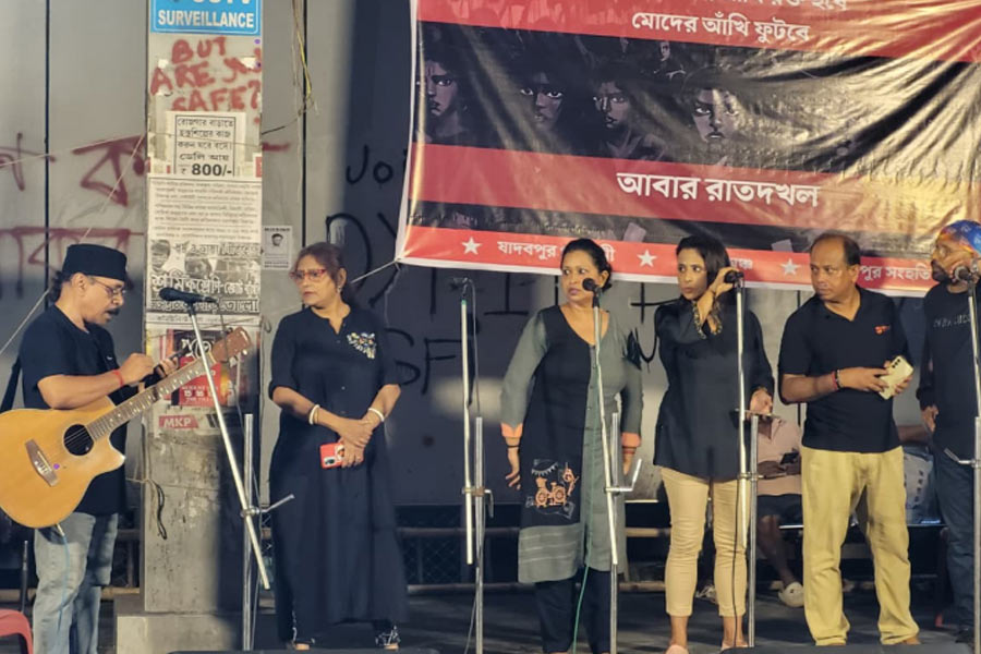 রাত ৯.৪৫: রাত দখলের মঞ্চে গান প্রতিবাদীদের। যাদবপুর ৮বি বাসস্ট্যান্ডে।