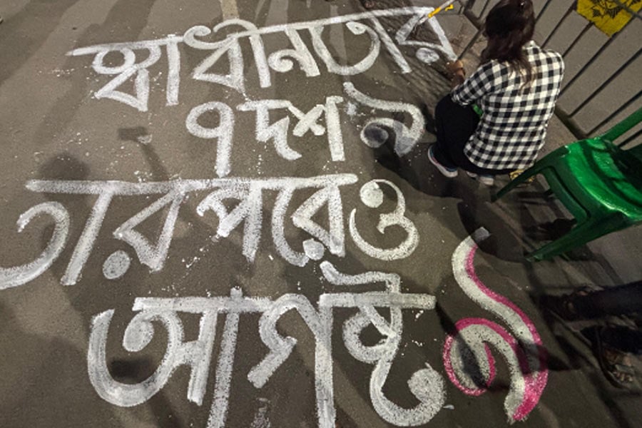 রাত ১১.০০: রাজপথই হয়ে উঠল দ্রোহের ক্যানভাস। স্বাধীনতা দিবসের প্রাক্কালে অভয়ার জন্য ন্যায়বিচার চেয়ে রাস্তায় তুলি হাতে প্রতিবাদের স্লোগান।