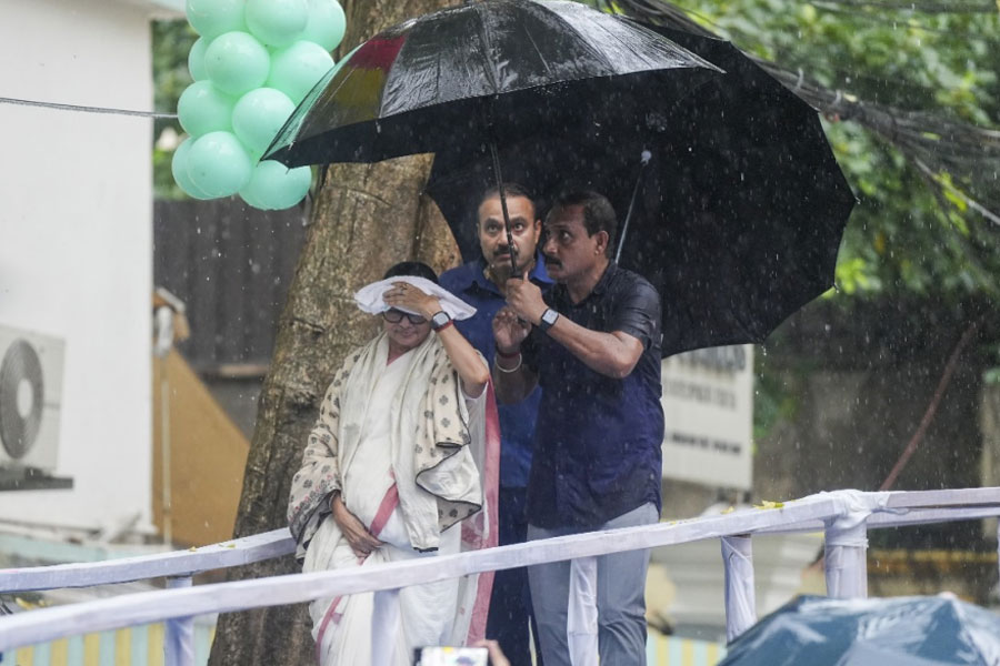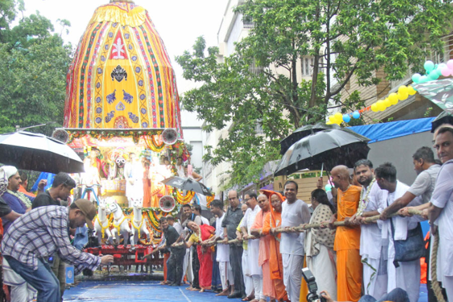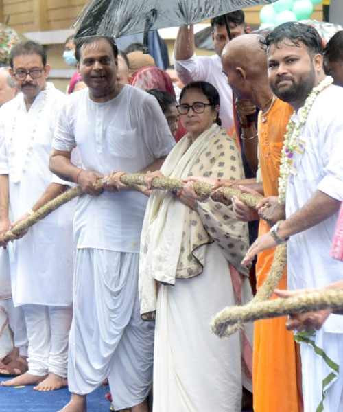 মিন্টো পার্কে ইসকন মন্দির থেকে রথ বেরিয়ে কলকাতার বিভিন্ন রাস্তা পরিক্রম করে। এবছরও ব্রিগেড প্যারেড গ্রাউন্ড পর্যন্ত রথযাত্রা হওয়ার কথা। তবে বাধ সেধেছে দুপুরে আচমকাই ঝেঁপে আসা বৃষ্টি। তা সত্ত্বেও নির্দিষ্ট সময়েই রবিবার মুখ্যমন্ত্রী মমতা বন্দ্যোপাধ্যায় (CM Mamata Banerjee) পৌঁছে যান ইসকন মন্দিরে। লাল-সাদা শাড়ি ছিল তাঁর পরনে। নিরাপত্তারক্ষীরা মুখ্যমন্ত্রীর মাথায় ছাতা ধরে তাঁকে মন্দির পর্যন্ত পৌঁছে দেন। মন্দির চত্বরে ঘুরে ঘুরে পুজো দেওয়ার সময়েও তাঁর মাথায় ছাতা ছিল। সঙ্গে ছিলেন ইসকনের পূজারিরা। রথের রশিতে টান দিয়ে যাত্রার শুভ উদ্বোধন করে দিলেন।
