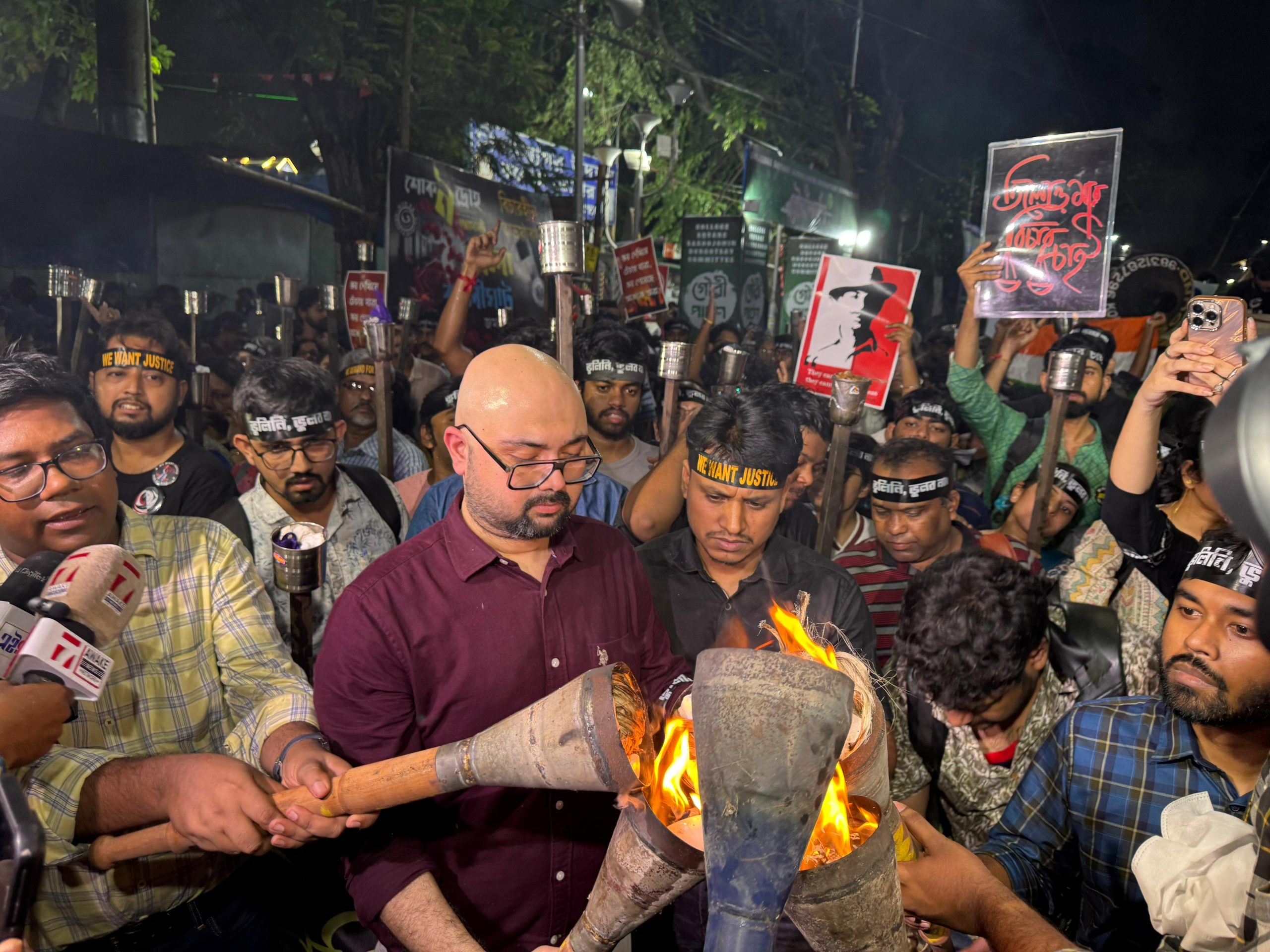 রাত ১০.২০: আর জি কর আন্দোলনের অন্যতম মুখ আসফাকুল্লা নাইয়া মশাল হাতে বলেন, “এই আন্দোলন চলবে। মানুষ ভোলেনি।”