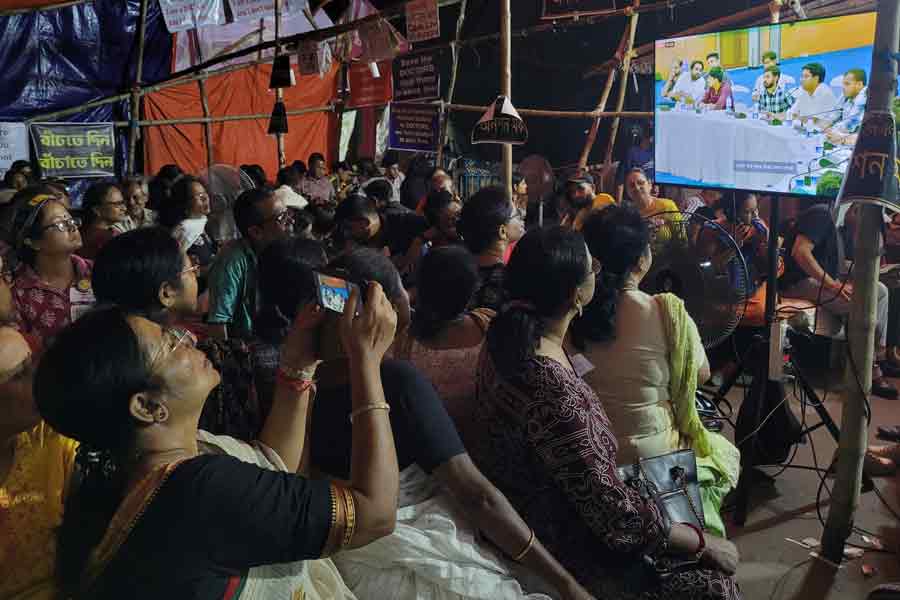 বিকেল ৫.২৯: ধর্মতলায় বসে লাইভ স্ট্রিমিংয়ে চোখ অনশনকারীদের।