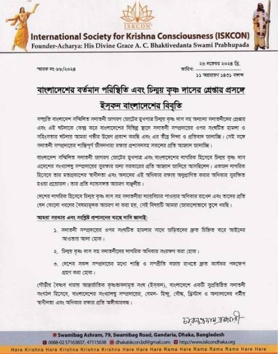 আর এনিয়ে মঙ্গলবার কলকাতার ইসকন শাখার তরফে ভাইস প্রেসিডেন্ট রাধারমন দাস বলেন, ”গতকাল চিন্ময় প্রভুর এক সহকারী আমাকে ফোন করে জানান যে তাঁকে ঢাকা বিমানবন্দর থেকে আটক করে অজ্ঞাত স্থানে নিয়ে যাওয়া হয়েছে। আজ শুনলাম, তাঁর বিরুদ্ধে দেশদ্রোহ মামলা হয়েছে। তার জন্য হিন্দুরা সকলে পথে নেমেছেন। অথচ প্রতিবাদীদের উপর মৌলবাদীরা আক্রমণ চালাচ্ছে, পুলিশও তাতে মদত দিচ্ছে বলে অভিযোগ পাচ্ছি। আমরা এসব মেনে নিচ্ছি না। ভারত সরকারের কাছে আবেদন, বাংলাদেশে হিন্দু নিপীড়ন রুখতে পদক্ষেপ নেওয়া হোক।”