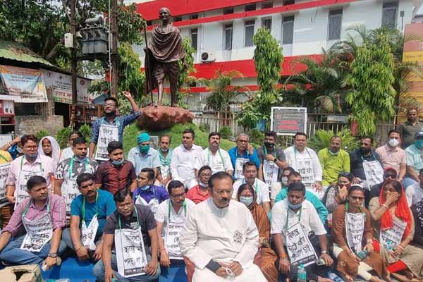দুপুর ১.৫৬: শিলিগুড়ির গান্ধী মূর্তির সামনে ধরনাতে মন্ত্রী অরূপ বিশ্বাস।