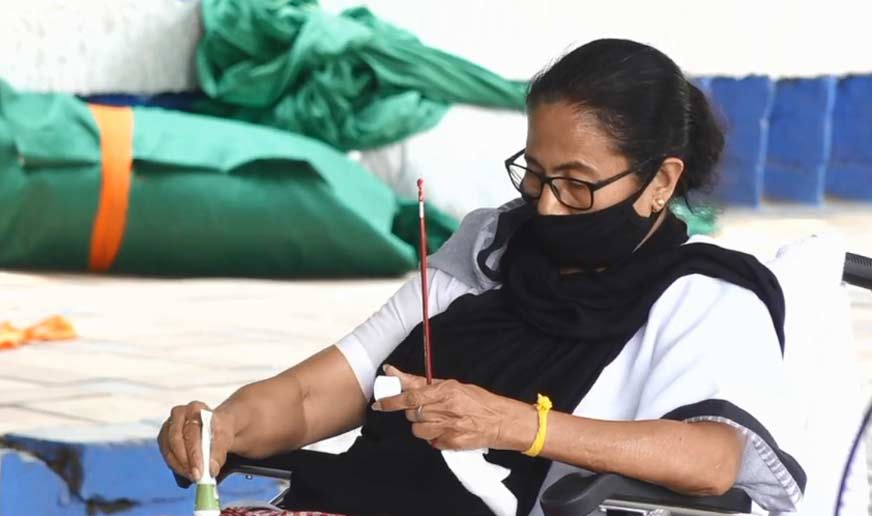 বেলা ১২.৪৪: গান্ধী মূর্তির পাদদেশে বসে চার নম্বর ছবি আঁকলেন তৃণমূল সুপ্রিমো।