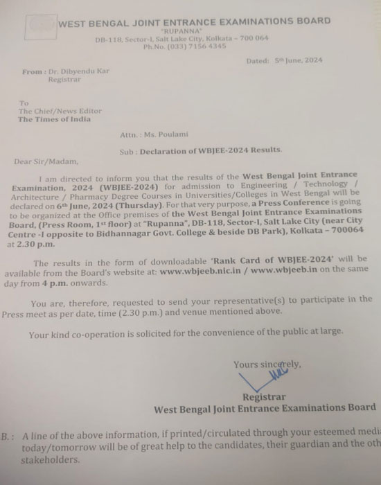 গত বছরের নভেম্বর মাসে ২০২৪ সালের রাজ্যের জয়েন্ট এন্ট্রান্স (WBJEE) পরীক্ষার দিনক্ষণ জানিয়ে বিজ্ঞপ্তি দেওয়া হয়। এ বছরের ২৮ এপ্রিল অর্থাৎ লোকসভা ভোটের (Lok Sabha Election 2024) মাঝেই হয়ে জয়েন্ট পরীক্ষা। একমাসের একটু বেশি সময় পর, ৬ জুন প্রকাশিত হচ্ছে ফলাফল। বৃহস্পতিবার দুপুরে সল্টলেকে বোর্ডের ভবন ‘রুপান্ন’তে হবে সাংবাদিক বৈঠক। বিকেল চারটে থেকে বোর্ডের ওয়েবসাইটে নিজেদের ফলাফল দেখতে পাবেন পরীক্ষার্থীরা। মিলবে র্যাঙ্ক কার্ড। তার পর কাউন্সেলিংয়ের দিনক্ষণ ঘোষণা করবে বোর্ড।
