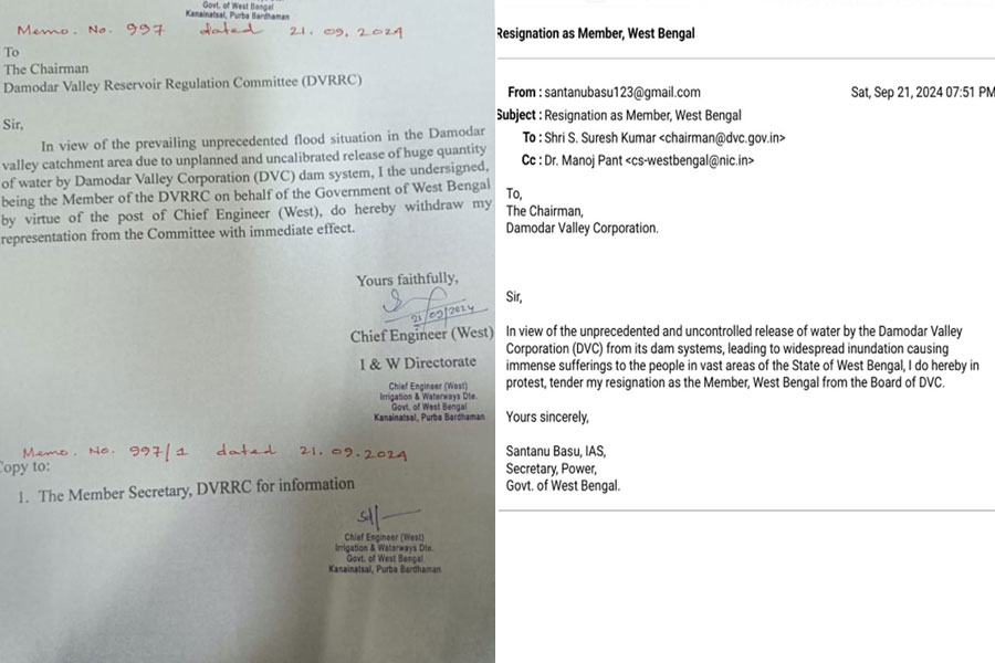 ডিভিসির চেয়ারম্যানকে দেওয়া ইস্তফা পত্রের চিঠিতে বিদ্যুৎ দপ্তরের সচিব লিখেছেন, ‘ডিভিসির বোর্ড থেকে পশ্চিমবঙ্গের সদস্য হিসাবে ইস্তফা দিচ্ছি। দুই জালাধার থেকে যেভাবে জল ছাড়া হয়েছে তার জেরে পশ্চিমবঙ্গের বিস্তীর্ণ এলাকার মানুষ দুর্ভোগে পড়েছেন। তার প্রতিবাদে আমি পদত্যাগ করছি।” প্রধান ইঞ্জিনিয়ার লেখেন,”ডিভিসি থেকে অপরিকল্পতি ভাবে জল ছাড়া হয়েছে। আমি পশ্চিমঙ্গের প্রতিনিধি হিসাবে পদ থেকে পদত্যাগ করলাম।”