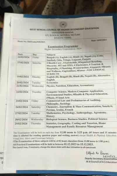 পরীক্ষা শুরু হচ্ছে ২০২৪ সালের ১৬ ফেব্রুয়ারি। চলবে ২৭ ফেব্রুয়ারি পর্যন্ত। অন্যান্যবার পরীক্ষা শুরু হত বেলা ১০টায়। এবার পরীক্ষা শুরুর সময় বদল হচ্ছে। শুরু হবে বেলা ১২টায়। শেষ হবে ৩টে ১৫ মিনিটে।