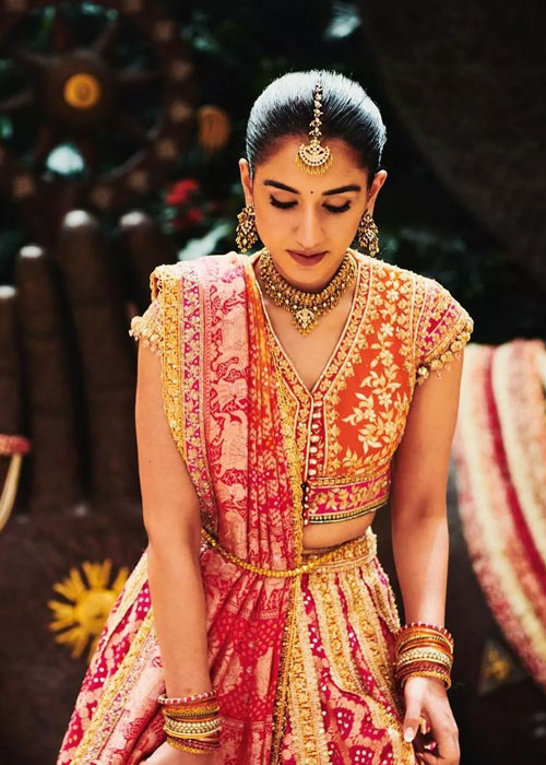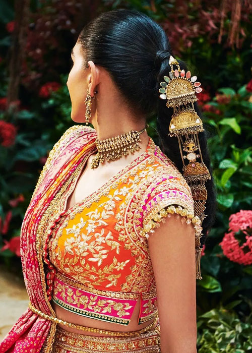 ডিজাইনার মণীশ মালহোত্রার (Manish Malhotra) তৈরি করা রানি-গোলাপি বাঁধনি প্রিন্টের জারদৌসি লেহেঙ্গা পরেছিলেন রাধিকা। ৩৫ মিটার দীর্ঘ কাপড়ে বাঁধনি প্রিন্ট করা হয়েছে। তার পাড়ে আসল সোনার জরি (Gold Zari) আর তার দিয়ে খোদাই করা দুর্গাশ্লোক। তার সঙ্গে রাধিকার পরনে ছিল ঐতিহ্যশালী কোটি ব্লাউজ। তাতেও ছিল ধাতব সুতোর কাজ। তার সঙ্গে মানানসই কানের দুল, নেকলেস, চুড়ি, টিকলি। বলা হচ্ছে, আপাদমস্তক ঐতিহ্য তুলে ধরা হয়েছে রাধিকার পোশাকে।