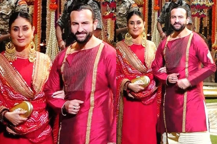 গণপতি অনুষ্ঠানের জন্যও তাই অভিষেক রায়ের পোশাকেই বাঙালিবাবু সাজে ধরা দিলেন সইফ আলি খান। সইফের পাশাপাশি ‘গিন্নি’ করিনা কাপুরও রং মিলান্তি লাল সালোয়ারে বাজিমাত করলেন। তবে অভিনেত্রীর পোশাক অভিষেক রায়ের ডিজাইন করা নয়।