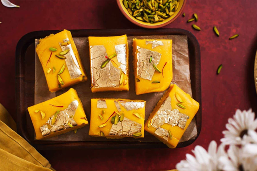 প্রথমেই আমটি ভালো করে ধুয়ে খোসা ছাড়িয়ে নিন। এবার এই টুকরো করা আমগুলি মিক্সিতে দিয়ে তাতে দুধ মিশিয়ে একটা ঘন মিশ্রণ তৈরি করে নিন। এবার কড়াই গরম করে তাতে এই মিশ্রণটি ঢেলে দিন। পরিমাণ মতো চিনি যোগ করুন। এবং ক্রমাগত মিশ্রণটি নাড়তে থাকুন। নইলে পাত্রের তলায় লেগে যাওয়ার সম্ভাবনা থাকবে। মিশ্রণটি একটু ঘন হলে তাতে নারকেল কোরা যোগ করুন। এবং কেশর দিয়ে আবার নাড়তে থাকুন। কিছুক্ষণের মধ্য়ে দেখবেন মিশ্রণটি শুকিয়ে এসেছে। তখন গ্যাস বন্ধ করে দিন। এবার একটি ফুড পেপারে মণ্ডর আকারে মিশ্রণটি দিয়ে হাতের সাহায্যে আকার দিন। এরপর বরফির আকারে তা কেটে নিন। এবং উপর থেকে হালকা ঘি ব্রাশ করে দিন। উপর থেকে ড্রাই ফ্রুটস ছড়িয়ে ২-৩ ঘণ্টা ফ্রিজে রেখে দিলেই তৈরি আপনার ম্যাঙ্গো বরফি।