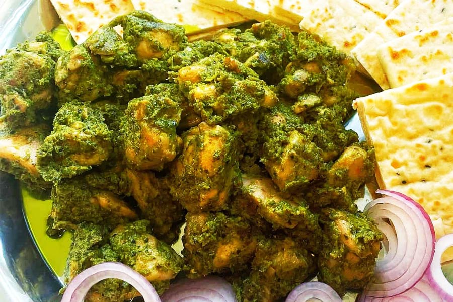 প্রথমে কাঁচা লঙ্কা, ধনেপাতা, পুদিনা পাতা ও টকদই মিক্সিতে পিষে নিন। এবার কড়াইয়ে তেল গরম করে পেঁয়াজ কুচি হালকা ভেজে নিয়ে মাংস দিয়ে ঢাকা কিছুটা রান্না করে নিন। এরপর কিছুটা গরম মশলা ভাল করে মিশিয়ে আবার ঢাকা দিয়ে দিন। আদা-রসুন বাটা দিয়ে নেড়েচেড়ে ২ মিনিটের জন্য রান্না করুন। এবার নুন ও দইয়ের পেস্টটা দিয়ে ভালভাবে মিশিয়ে কম আঁচে ৫ মিনিট ঢেকে আরও কিছুক্ষণ রান্না করে নিন। ঢাকা খুলে নেড়েচেড়ে আবার কিছুক্ষণ ঢাকা দিয়ে ২-৩ মিনিট রান্না করে নিন। গ্রেভি একদম শুকিয়ে নেবেন, যাতে মশলা চিকেনের গায়ে লেগে থাকে। হয়ে গেলে তাওয়ার ঘি ব্রাশ করে তার উপর মাংসের টুকরোগুলো রেখে এপিঠ-ওপিঠ করুন। তাওয়ার মাঝে একটা বাটিতে জ্বলন্ত কয়লা দিয়ে তাতে ঘিয়ে ঢেকে দিন। দারুণ স্মোকি ফ্লেভার হবে।