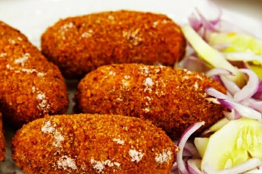 প্রথমে আলু-এচোড় সিদ্ধ করে ঠান্ডা হলে মিক্স করে নিন। ফ্রাই়ং প্যানে তেল গরম করে বাদাম সোনালী করে ভেজে নিন। বাদাম গুলিকে ভেঙে অর্ধেক করে নিন। এবার সেই তেলে মৌরি আর জিরে ফোড়ন দিয়ে একে একে বিট ও গাজর ভালো করে কষিয়ে নিন। সঙ্গে পরিমাণ মতো লবণ ও চিনি দিয়ে দিন। এবার সিদ্ধ এচোড় ও আলু দিয়ে ৫ মিনিট রান্না করুন। মিশ্রন কষে এলে জিরা গুঁড়ো, ধনে গুঁড়ো, লঙ্কার গুঁড়ো মিশিয়ে ভালো করে কষিয়ে নিন। এবার আগে থেকে ভাজা বাদাম আর কালোজিরে, কারি পাতা দিয়ে ভালো করে মিশিয়ে নামিয়ে নিন। প্যানে সামান্য তেল গরম করে চিংড়ি মাছগুলো ভেজে নিন। এবার ৩ টি ডিম সামান্য লবণ দিয়ে ফেটিয়ে নিন। আরেকটি পাত্রে কর্নফ্লাওয়ার ও ময়দা দিয়ে জল মিশিয়ে মিশ্রণ বানিয়ে নিন। এবার ভেজিটেবল সিদ্ধের মধ্যে চিংড়ির পুর দিয়ে মন্ড করে নিন। মন্ডগুলি কর্ন ফ্লাওয়ার ময়দার মিশ্রণে চুবিয়ে বিস্কুটের গুঁড়ো লাগিয়ে আবার ফেটানো ডিম চুবিয়ে আবার বিস্কুটের কোট লাগিয়ে গরম তেলে ভেজে নিন। এবার সস ভেজিটেবল দিয়ে পরিবেশন করুন।