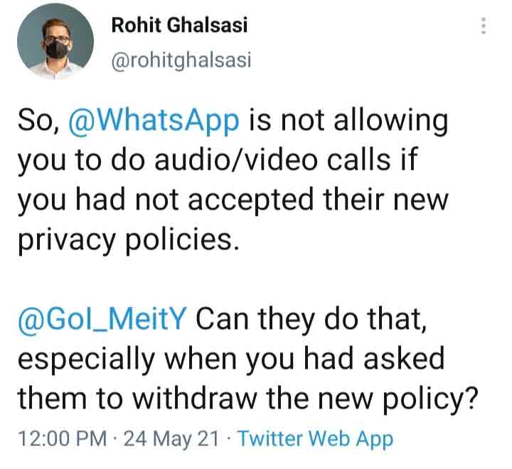 হোয়াটসঅ্যাপের নয়া প্রাইভেসি পলিসি গ্রহণের শেষ তারিখ ছিল ১৫ মে। বলা হয়েছিল, নয়া নীতি গ্রহণ না করা হলে বন্ধ হয়ে যাবে এই মেসেজিং অ্যাপ। নয়া পলিসির বিরোধিতা করেছে খোদ কেন্দ্রীয় সরকারও। এ নিয়ে কেন্দ্রের সঙ্গে টানাপোড়েন চলছে। এর মাঝেই সোমবার টুইটারে জনৈক রোহিত ঘালসাসি অভিযোগ করেন, তিনি হোয়াটসঅ্যাপ থেকে ভিডিও বা অডিও কল করতে পারছেন না। তিনি আরও জানান, হোয়াটসঅ্যাপের নয়া প্রাইভেসি পলিসি গ্রহণ করেননি তিনি। এর পরই এই সমস্যা তৈরি হয়েছে। এরকম একাধিক অভিযোগ সামনে এসেছে।