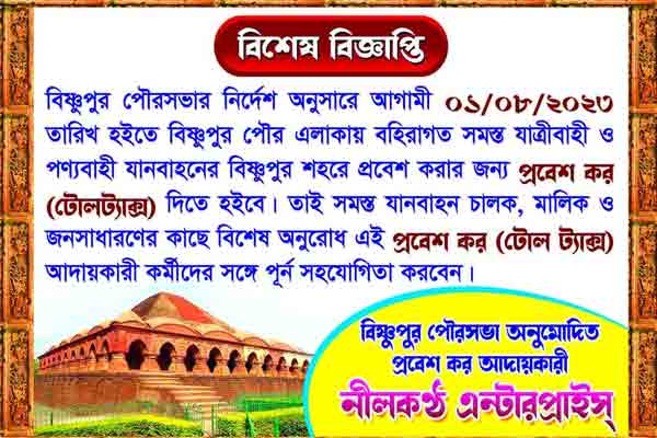 এ প্রসঙ্গে বিষ্ণুপুর পুরসভার চেয়ারম্যান গৌতম বিশ্বাস বলেন, “অন্যান্য শহরেও এই কর নেওয়া হয়। বিষ্ণুপুরেও এবার থেকে এন্ট্রি ট্যাক্স বা প্রবেশ কর নেওয়া হবে। বেসরকারি সংস্থাকে এই দায়িত্ব দেওয়া হয়েছে।” জানা গিয়েছে, শহরের ঢোকার মুখে টোল আদায়কারী ক্যাম্প করবে দায়িত্বপ্রাপ্ত বেসরকারি সংস্থা। সংস্থার মালিক চেয়ারম্যান ঘনিষ্ঠ বলে খবর।