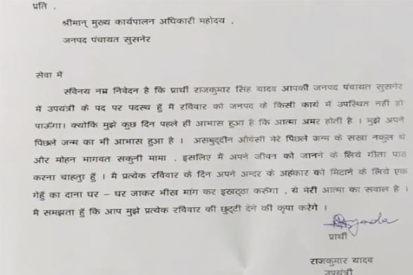 মধ্যপ্রদেশের ওই সাব ইঞ্জিনিয়ারের নাম রাজকুমার যাদব। আগর মালওয়া জেলার মনরেগা প্রকল্পে সাব ইঞ্জিনিয়ার হিসেবে কর্মরত তিনি। সিইও-কে চিঠি দিয়ে এমনটাই জানিয়েছেন রাজকুমার। লেখেন, “স্বপ্নে দেখেছি মিম-এর প্রধান তথা সাংসদ আসাউদ্দিন ওয়েইসি আমার আগের জন্মের বন্ধু ছিলেন। নাম ছিল নকুল। সেখানে আরএসএস প্রধানও ছিলেন। তিনি ছিলেন শকুনি মামা।” নিজের সেই অতীত সম্পর্কে জানতেই এবার শ্রীমদ্ভগবদগীতা পাঠ করার সিদ্ধান্ত নিয়েছেন রাজকুমার।