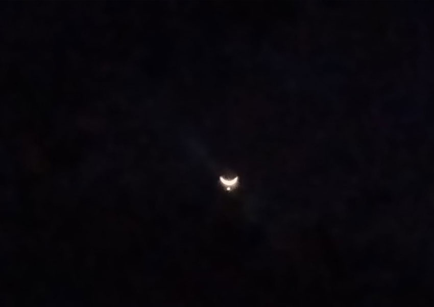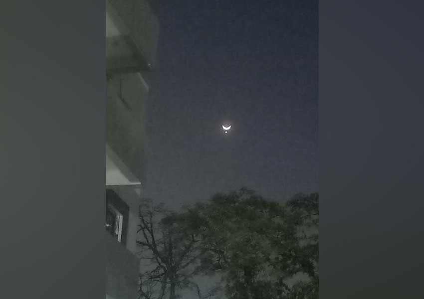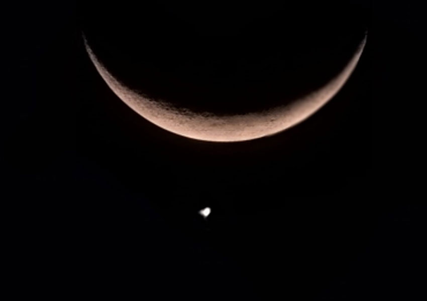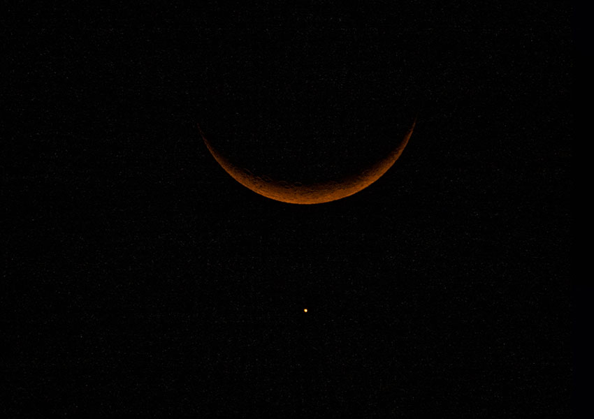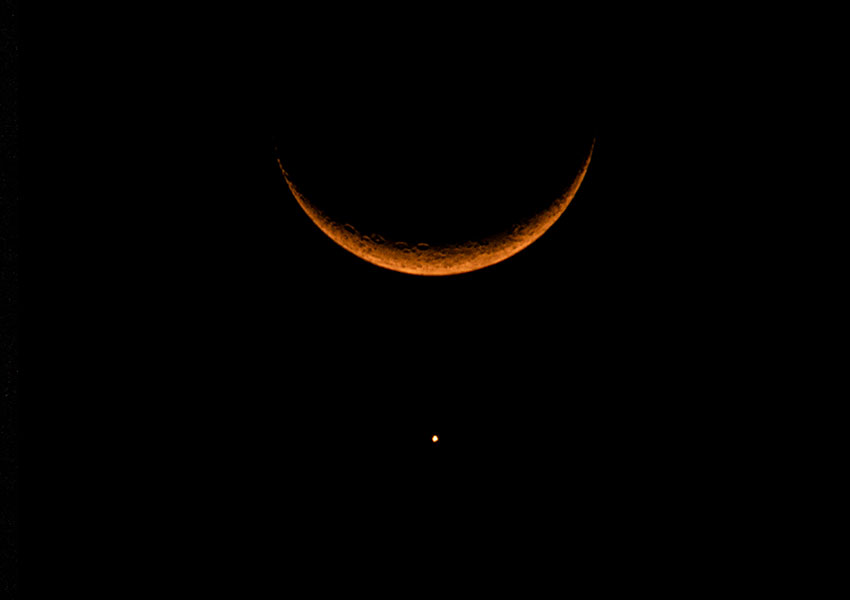 অমাবস্যার দিন তিনেক পরের চাঁদের মাত্র ৯ শতাংশ ছিল দৃশ্যমান। সেই চাঁদের কাস্তের পাশে সন্ধ্যাতারার উপস্থিতি তৈরি করল অনুপম দৃশ্যকাব্য।