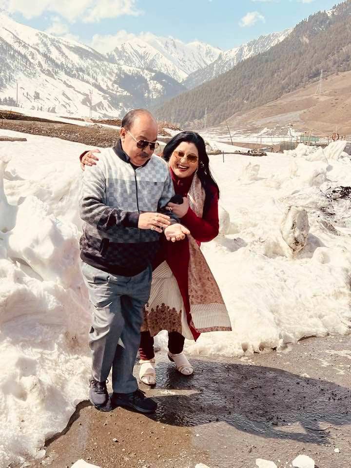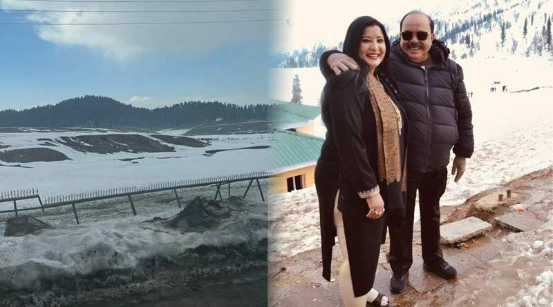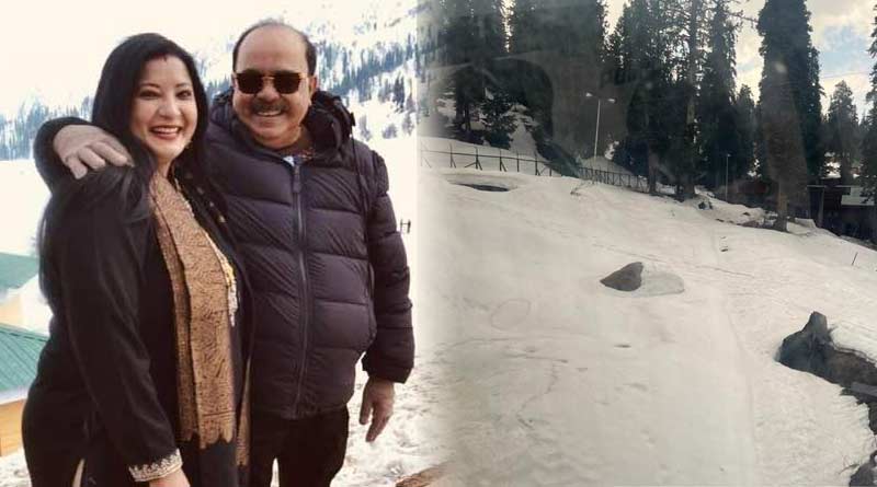 গুলমার্গে বরফের মাঝে খোশমেজাজে বৈশাখী বন্দ্যোপাধ্যায় ও শোভন চট্টোপাধ্যায়। (ছবি: ফেসবুক)