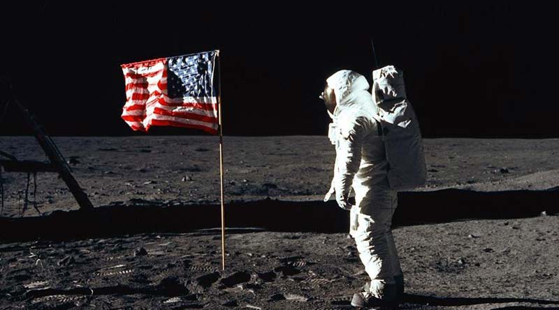 চাঁদের মাটিতে দাঁড়িয়ে থাকা আমেরিকান পতাকার ছবি ঘাঁটলে সত্যি বিস্মিত হতে হয়। বাজ অলড্রিন চন্দ্রপৃষ্ঠে দাঁড়িয়ে স্যালুট করছেন মার্কিন পতাকাকে। এই ছবি অ্যাপলো ১১ মিশনের অন্যতম আইকনিক ছবি। সেই সময়ে ওই ছবিটিকে অনেকেই রাশিয়ার (তৎকালীন সোভিয়েত ইউনিয়নের ) সঙ্গে স্পেস রেসে এগিয়ে যাওয়ার প্রচ্ছন্ন মার্কিন বার্তা বলেই ধরেন। কিন্তু ষড়যন্ত্রকারীদের প্রশ্ন এটাই, যেখানে হাওয়াবাতাসই নেই চাঁদে, সেখানে আমেরিকার পতাকায় হাওয়া খেলছে কী করে?