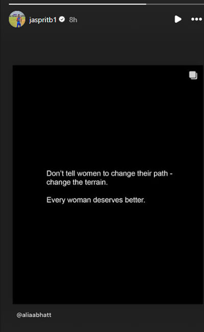 আলিয়ার পোস্টের শেষাংশটিই বুমরাহ তুলে দিয়েছেন ইনস্টাগ্রাম (Instagram)স্টোরিতে। তাঁরও বার্তা, নারীকে রাস্তা বদল করতে বলা নয়, বরং তার আশপাশের পরিবেশ বদলেই জোর দিতে হবে। মনে রাখতে হবে, প্রত্যেক নারীর আরও ভালোভাবে বাঁচার অধিকার আছে। এর আগে আর জি কর হাসপাতালে যৌন হেনস্তা ও হত্যাকাণ্ডের ঘটনায় প্রতিক্রিয়া দিয়েছিলেন ভারতীয় ক্রিকেটের প্রাক্তন অধিনায়ক সৌরভ গঙ্গোপাধ্যায় (Sourav Ganguly)। ঘটনার নৃশংসতার কথা উল্লেখ করে কড়া শাস্তির দাবি তুলেছিলেন তিনি। এবার প্রতিবাদে সুর চড়ালেন জশপ্রীত বুমরাহ।