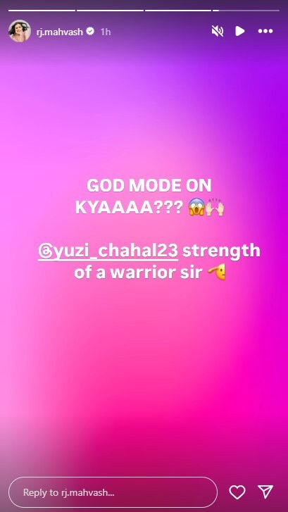 লেগস্পিনারের এমন চোখধাঁধানো পারফরম্যান্স দেখে মাহভাশ উচ্ছ্বসিত হবেন না, তা কি হতে পারে? যথারীতি ইনস্টা স্টোরিতে চাহালকে নিয়ে তিনি দু’লাইন লিখে ফেলেছেন। মাহভাশের প্রশ্ন, ‘চাহাল কি ঈশ্বরীয় ফর্মে রয়েছেন? আসলে তাঁর মধ্যে যোদ্ধার মতো শক্তি ছিল।’ লেগস্পিনারকে ‘স্যর’ সম্বোধন করে স্যালুটও ঠুকেছেন মাহভাশ। চলতি আইপিএলেই একাধিকবার চাহাল-মাহভাশকে দেখা গিয়েছে। বারবার প্রশ্ন উঠেছে, চাহাল-মাহভাশের সম্পর্ক কি কেবলই বন্ধুত্বের?