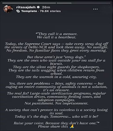 এই পরিস্থিতিতে ইনস্টাগ্রাম স্টোরিতে রোহিত-পত্নী লেখেন, ‘অনেকের কাছে এটা ভয়াবহ হতে পারে। কিন্তু আমাদের কাছে তা নয়। সুপ্রিম কোর্টের পক্ষ থেকে প্রত্যেকটা পথকুকুরকে সরিয়ে দেওয়ার কথা বলা হয়েছে। অর্থাৎ, সূর্যের আলো, স্বাধীনতা সব কিছু ছিনিয়ে নেওয়া হবে ওদের থেকে। হ্যাঁ, এটা ঠিক যে, কামড়ানো বা নিরাপত্তা নিয়ে সমস্যা রয়েছে। কিন্তু এর অর্থ এই নয় যে, গোটা প্রাণী সম্প্রদায়কে খাঁচায় ভরে রাখতে হবে।’