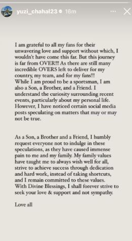 তবে একটি ‘কিন্তু’ থেকে গিয়েছে আজকের পোস্টে। চাহাল লিখেছেন, ‘আমি লক্ষ্য করেছি বেশ কিছু সোশাল মিডিয়া পোস্টে এমন গুঞ্জন রয়েছে যা হয়তো সত্যি, হয়তো নয়।’ সেই সঙ্গেই তাঁর আর্জি এমন গুঞ্জন সৃষ্টি না করারও। কেননা ‘এর ফলে আমাকে ও আমার পরিবারকে তীব্র যন্ত্রণার মধ্যে পড়তে হয়েছে।’