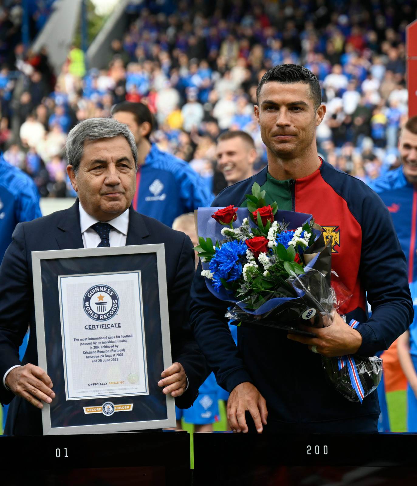 রেকর্ড আর রোনাল্ডো সমার্থক হয়ে গিয়েছে। আইসল্যান্ডের বিরুদ্ধে দেশের হয়ে ২০০ নম্বর ম্যাচে নামলেন। গিনেস বুকে নাম তুলে নিলেন। বিশ্বের প্রথম ফুটবলার হিসেবে ২০০টি আন্তর্জাতিক ম্যাচ খেললেন রোনাল্ডো। ম্যাচের বল গড়ানোর আগে রোনাল্ডোর হাতে ফুলের স্তবক এবং গিনেস ওয়ার্ল্ড রেকর্ডের তরফ থেকে শংসাপত্র দেওয়া হল। তবে গোলের জন্য পর্তুগাল এবং রোনাল্ডোকে অপেক্ষা করে থাকতে হল ৮৯ মিনিট পর্যন্ত।