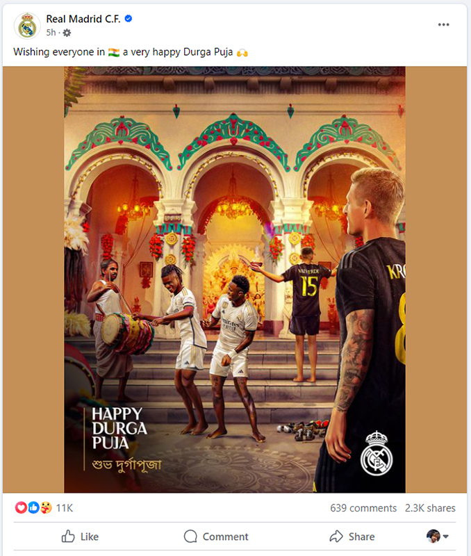 ছবিতে দেখা যাচ্ছে, এক ঢাকী ঢাক বাজাচ্ছেন। ঢাকের তালে পা দোলাচ্ছেন ফুটবলাররা। দূরে দেখা যাচ্ছে দুর্গা প্রতিমার মুখ। রিয়ালের পোস্টে মন্তব্য করেছেন ক্রীড়াপ্রেমীরা। কেউ লিখেছেন, ”শুভ শারদীয়া। কলকাতা আসার আমন্ত্রণ রইলো।” কেউ আবার লিখেছেন, ”হ্যাপি দুর্গাপুজা। ফ্রম বেঙ্গল, ইন্ডিয়া।”