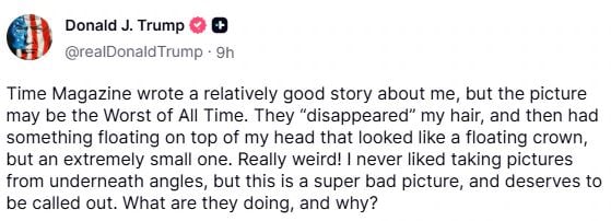 কিন্তু ঠিক কী কারণে ছবিটি নিয়ে এমন বিরক্ত হলেন তিনি? নিজের সোশাল মিডিয়া ট্রুথ সোশালে তিনি সবটাই লিখেছেন। তাঁকে দাবি করতে দেখা গিয়েছে, ‘টাইম ম্যাগাজিন আমাকে নিয়ে একটা অপেক্ষাকৃত ভালো স্টোরি করেছে। কিন্তু যে ছবি দিয়েছে সেটা সম্ভবত সর্বকালের সবচেয়ে খারাপ ছবি। ওরা আমার চুলটাই গায়েব করে দিয়েছে। এবং আমার মাথার উপরে যেন একটা ভাসমান মুকুট দেখা যাচ্ছে, সেটাও একেবারে ছোট্ট। সত্যিই বিদঘুটে! নিচের অ্যাঙ্গল থেকে ছবি আমি কোনওকালেই পছন্দ করি না। কিন্তু এটা অত্যন্ত খারাপ ছবি, এবং সেটা বাতিল করাই উচিত ছিল। কী করছেন আপনারা এসব? কেনই বা করছেন?’