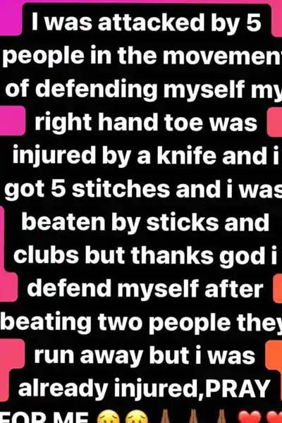 সেসব খুশির দিন কাটিয়ে এবার ভয়াবহ অভিজ্ঞতার মুখে পড়লেন ইন্টারনেট সেনশেন কিলি পল। নিজের ইনস্টাগ্রামে তিনি পোস্ট করে জানান, “পাঁচজন মিলে আমার উপর হামলা চালায়। ছুরি চালায়, লাঠি দিয়ে মারধর করে। ডান হাত দিয়ে আটকাতে চাইছিলাম, তাই হাত জখম হয়েছে। হাতে ৫টা সেলাই পড়েছে। যারা আমাকে মারছিল, তারা পালিয়েছে। কিন্তু ভগবানের সহায়তায় আমি নিজেকে বাঁচাতে পেরেছি।”